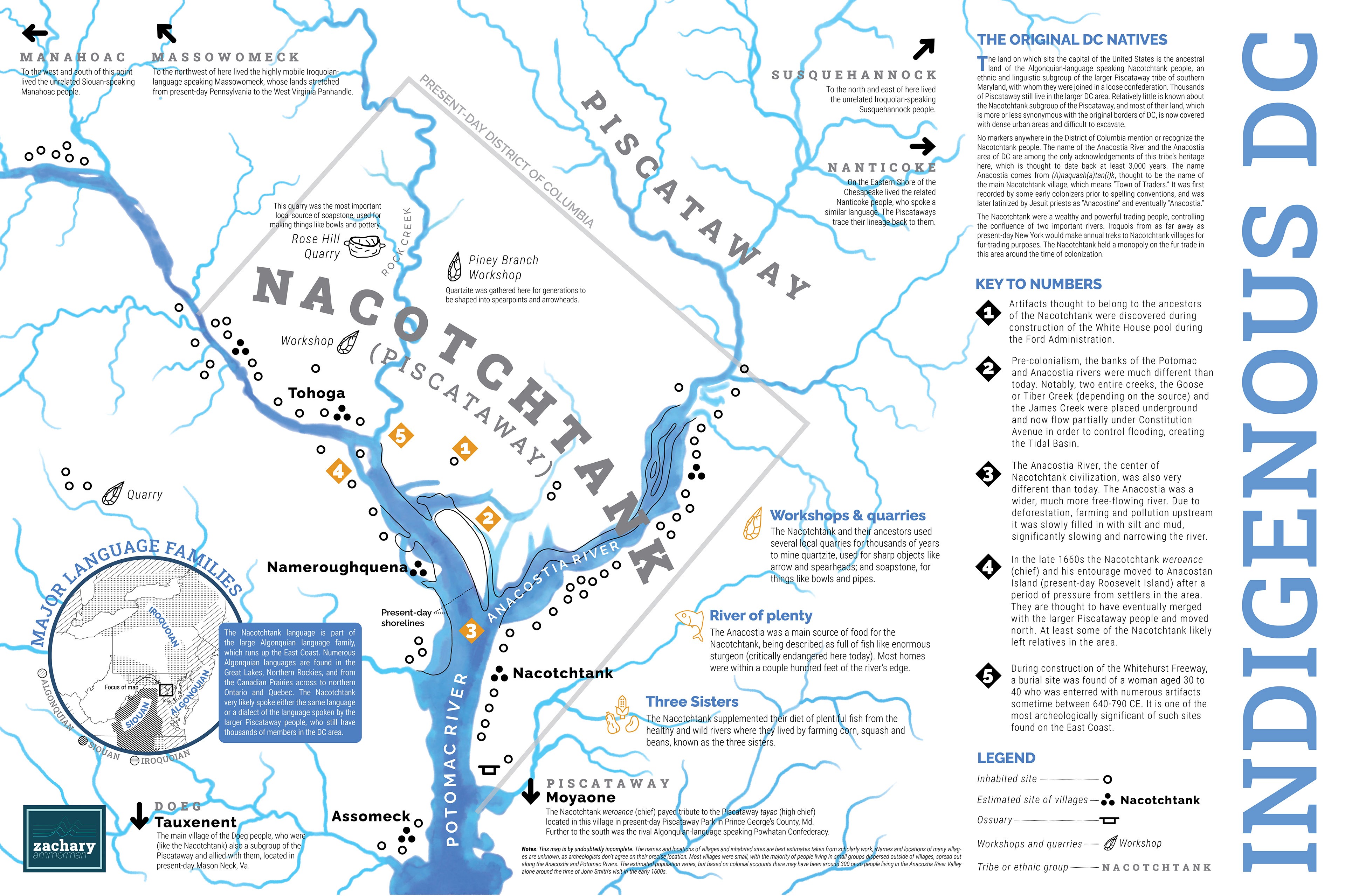A long-term project to map the known Nacotchtank sites in the present-day District of Columbia, which is the ancestral land of the indigenous Nacotchtank people, an ethnic and linguistic subgroup of the Pisctaway people, who still have thousands of living descendants in the DC area today. The goal is to acknowledge the fact that the land where the capital of the United States sits is stolen and once belonged to the Nacotchtank people, and to fill the relatively huge hole in the public's awareness and knowledge of this fact. This map is a work in progress.