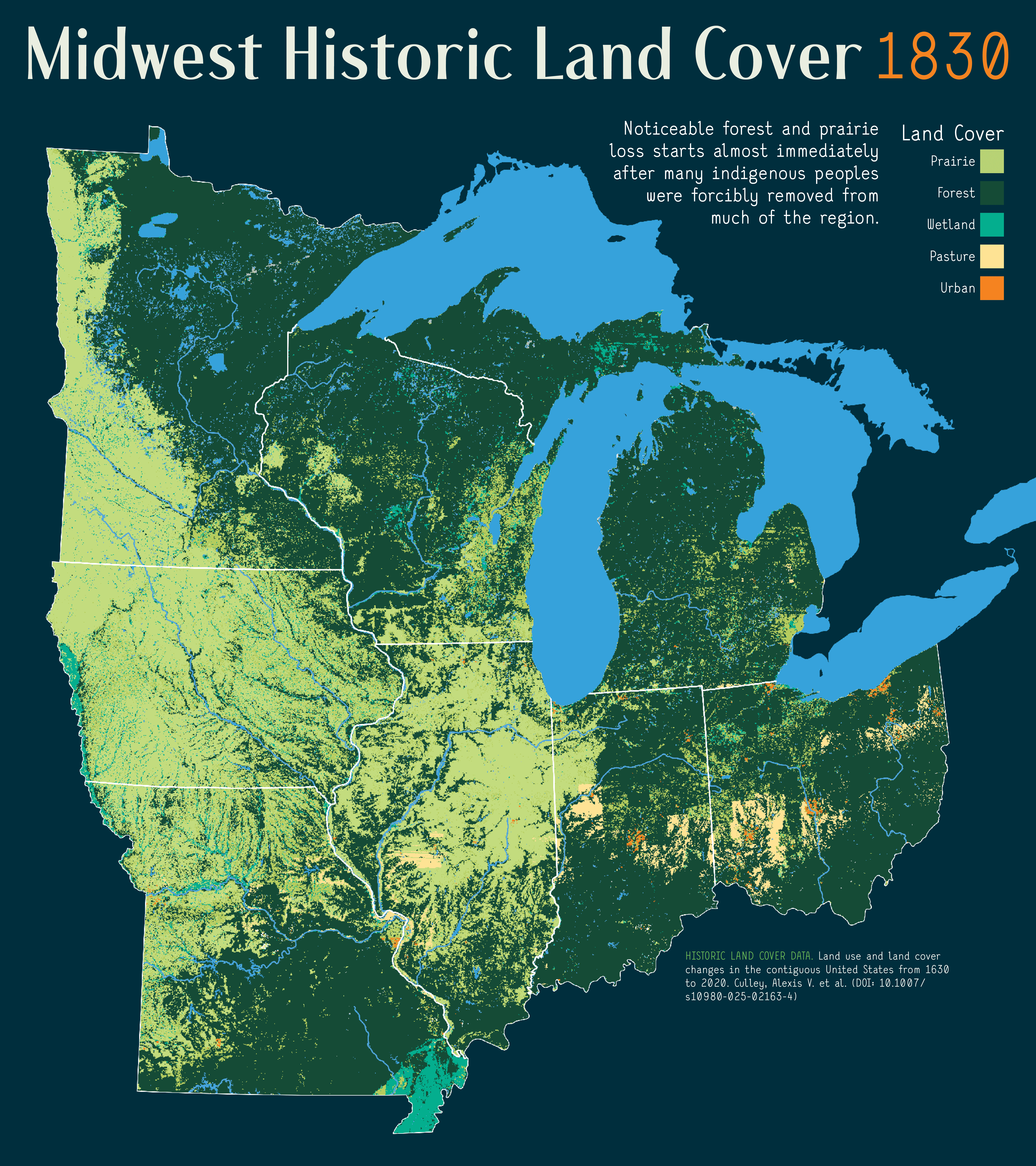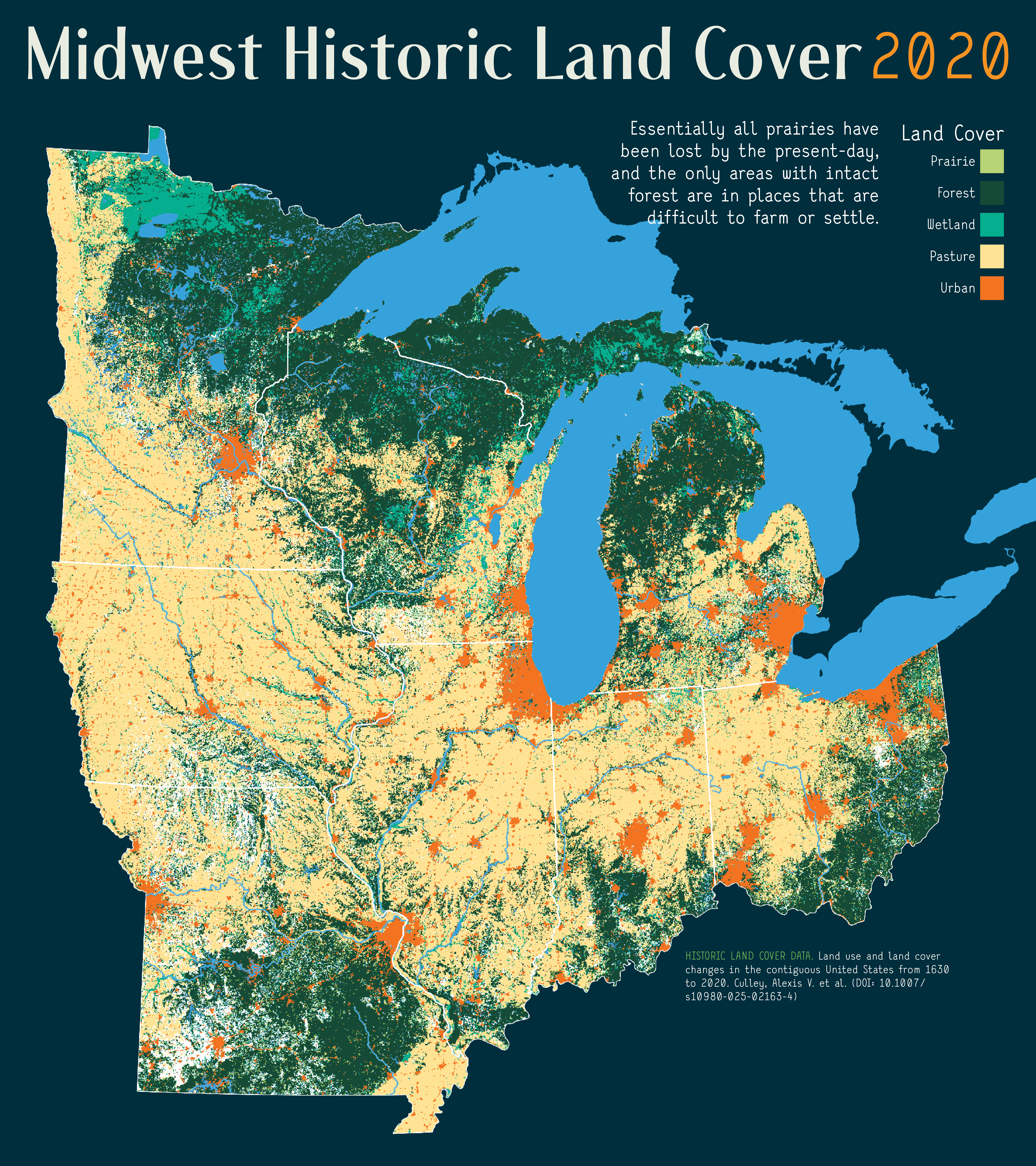 A map of land cover change in the Midwest, which is a story of large-scale forest and prairie loss. After the historic forest cover maps, keep scrolling to see the Midwest Forest Landscape Integrity, and Midwest Forest Biomass.